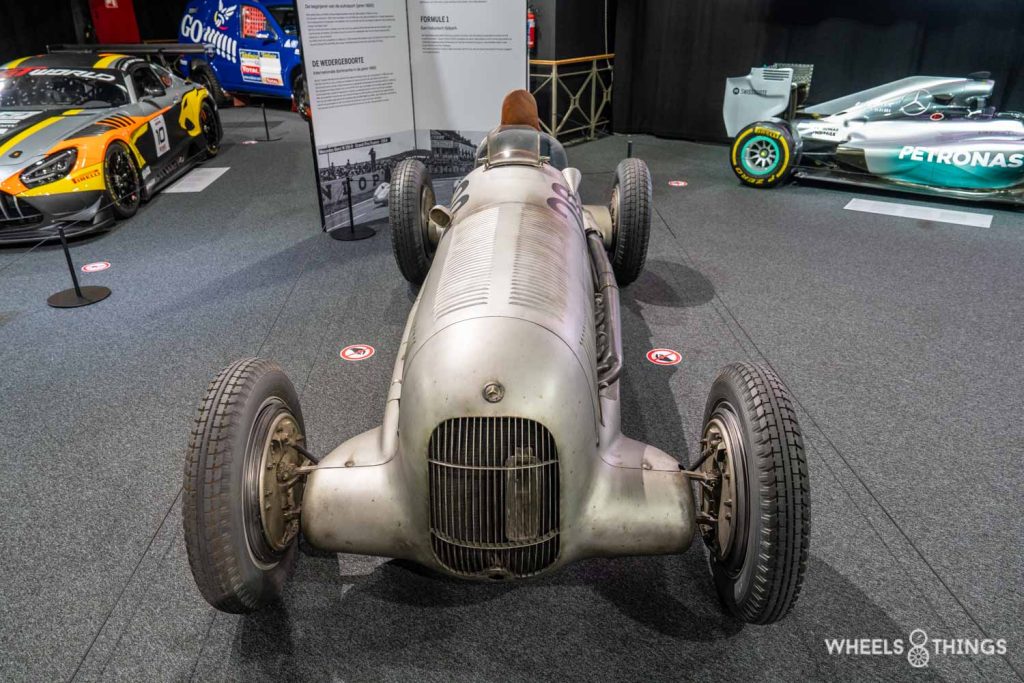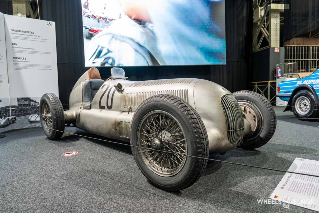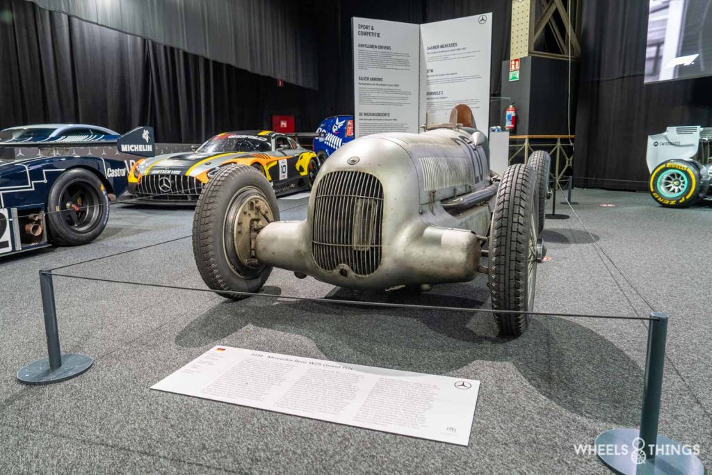 Hierboven zien we de eerste Mercedes-Benz racewagen voor de nieuwe Grand Prix-formule van 1934. De regels waren dat het totale gewicht de 750kg niet mocht overschrijden. De auto had een motor met 3,4 liter inhoud en beschikte over een compressor waardoor hij initieel over 354 pk beschikte. Tijdens de scrutineering bleek de auto één kilogram boven het maximale gewicht uit te komen. Op één dag voor de Internationale Eifelrace beslisten de monteurs om alle verf van de auto te schrapen. Zo ontstond de zilveren kleur waaruit later de naam ‘Silberpfeile’ zou ontstaan. Manfred von Brauchitsch won de race. De daaropvolgende jaren haalde de auto nog meerdere Grand-Prix overwinningen binnen.
