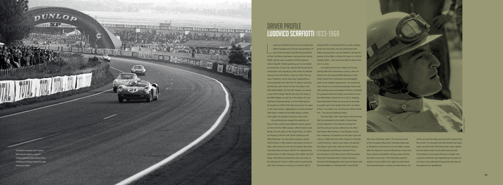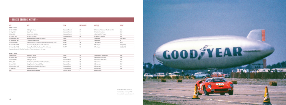 The car’s drivers are also discussed at length: Ludovico Scarfiotti, Lorenzo Bandini, Mike Parkes, Umberto Maglioli, Jean Guichet, Nino Vaccarella, Willy Mairesse, Mauro Bianchi, Major William “Bill” Cooper, Charlie Kolb, Dick Drexler, Pedro Rodríguez, Charles “Chuck” Parsons