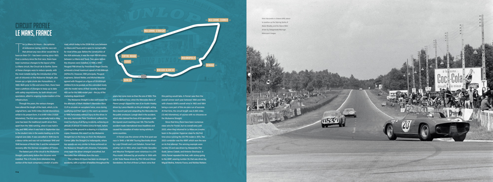 The car raced on three major circuits: Sebring, Le Mans and Road America. Detailed circuit maps and reports of all three circuits are included in the book.